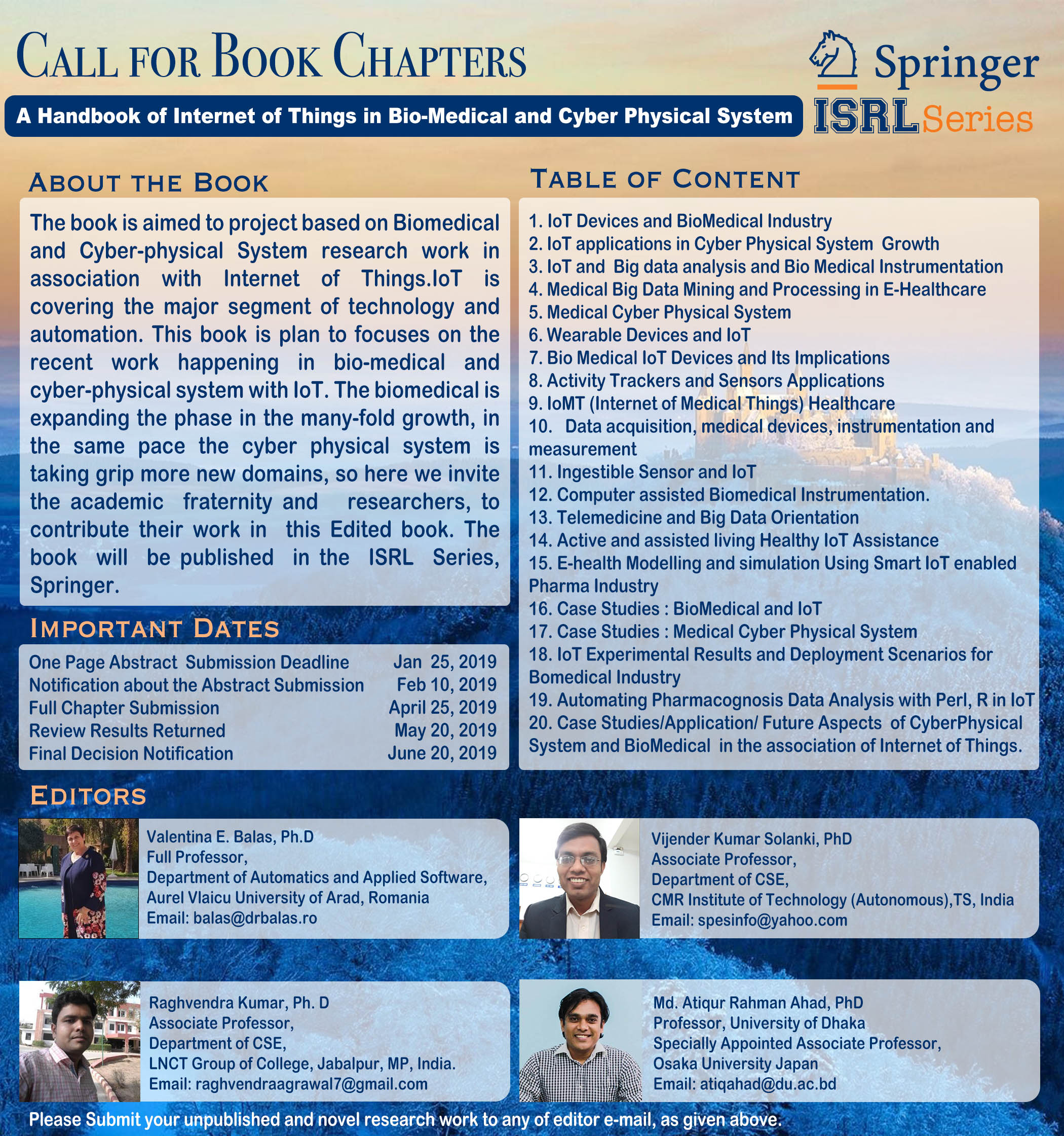 - Edited Book: Call for Book Chapters for "A Handbook of Internet of Things in Biomedical and Cyber Physical Systems", Publisher: Springer Nature Switzerland AG, Gewerbestrasse 11, 6330 Cham, Switzerland
